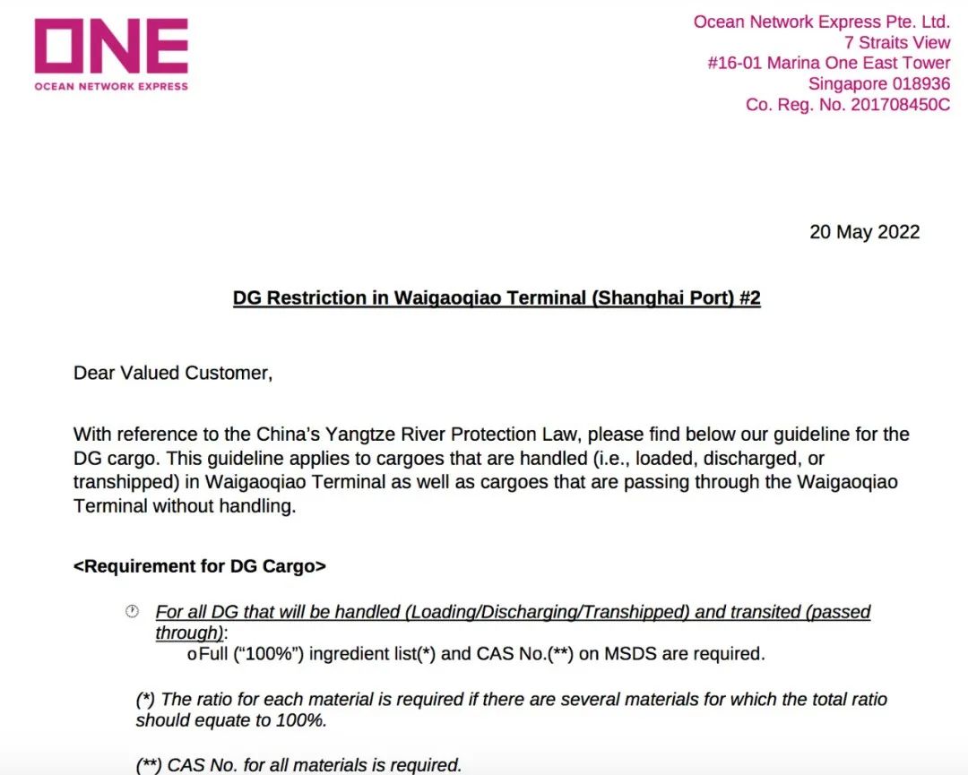 5月20日,海洋網(wǎng)聯(lián)船務(wù)(ONE)發(fā)布公告稱,鑒于中國《長江保護法》的要求,特發(fā)布上海港(外高橋碼頭)危險品海運進出口貨物指南。